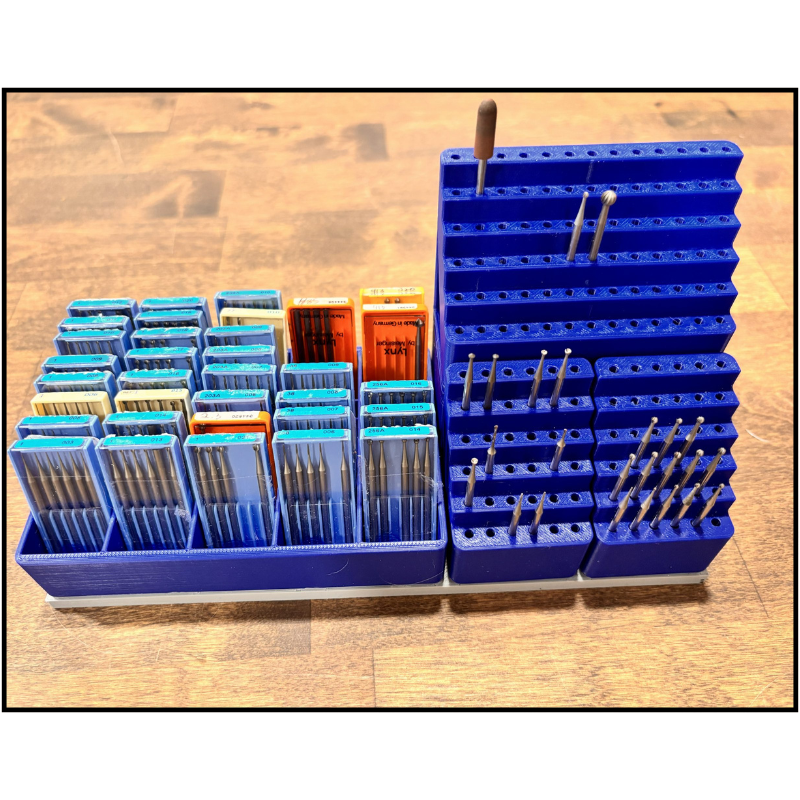 Keep your burs organized and visible for productivity. The Bur Management Kit brings an end to bur chaos by giving both your in-use burs and your spare bur boxes a dedicated, structured place at your bench. The bur stadium cubes keep active burs within easy reach, while the bur box index storage tray allows you to quickly see, sort, and inventory your boxes of spares. Like all Jewelry Bench Blocks components, the Bur Management Kit is part of a modular, precision-engineered system designed to transform your workspace. Use these blocks on their own or integrate them seamlessly with the rest of the Jewelry Bench Blocks ecosystem to build a custom organization system that fits your workflow—and helps you make more jewelry with less frustration.